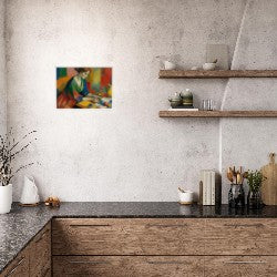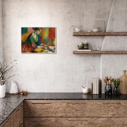 Woman in Colors wall art presents a captivating scene where a woman, engaged in daily activities, is surrounded by vibrant, abstract colors. The blend of geometric shapes and a rich palette creates a dynamic and visually stimulating composition, making the ordinary moment extraordinary. This piece infuses energy into the room, with its lively colors and soft yet bold brushstrokes bringing an artistic flair to everyday life. Perfect for those who appreciate art that blurs the line between the abstract and the real.