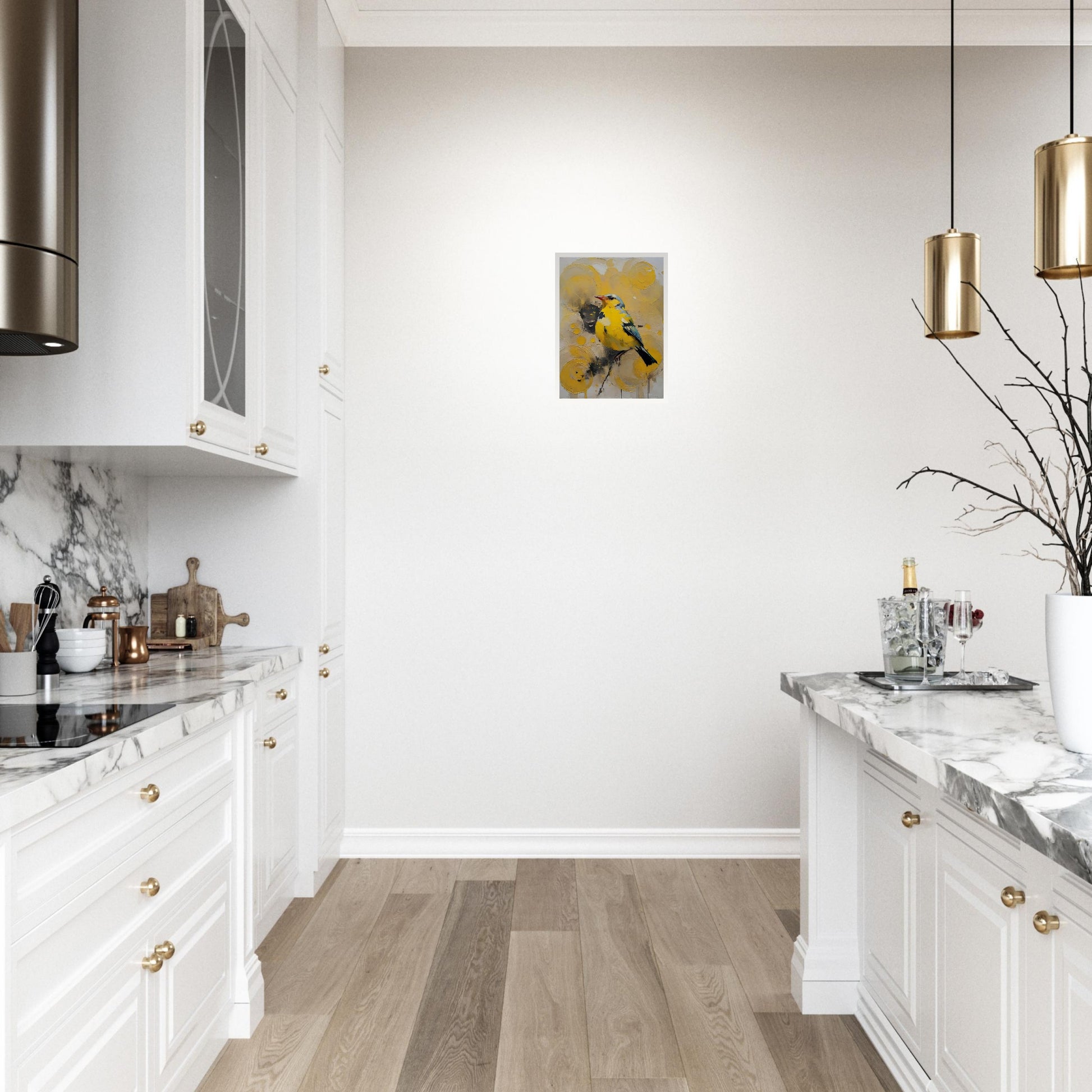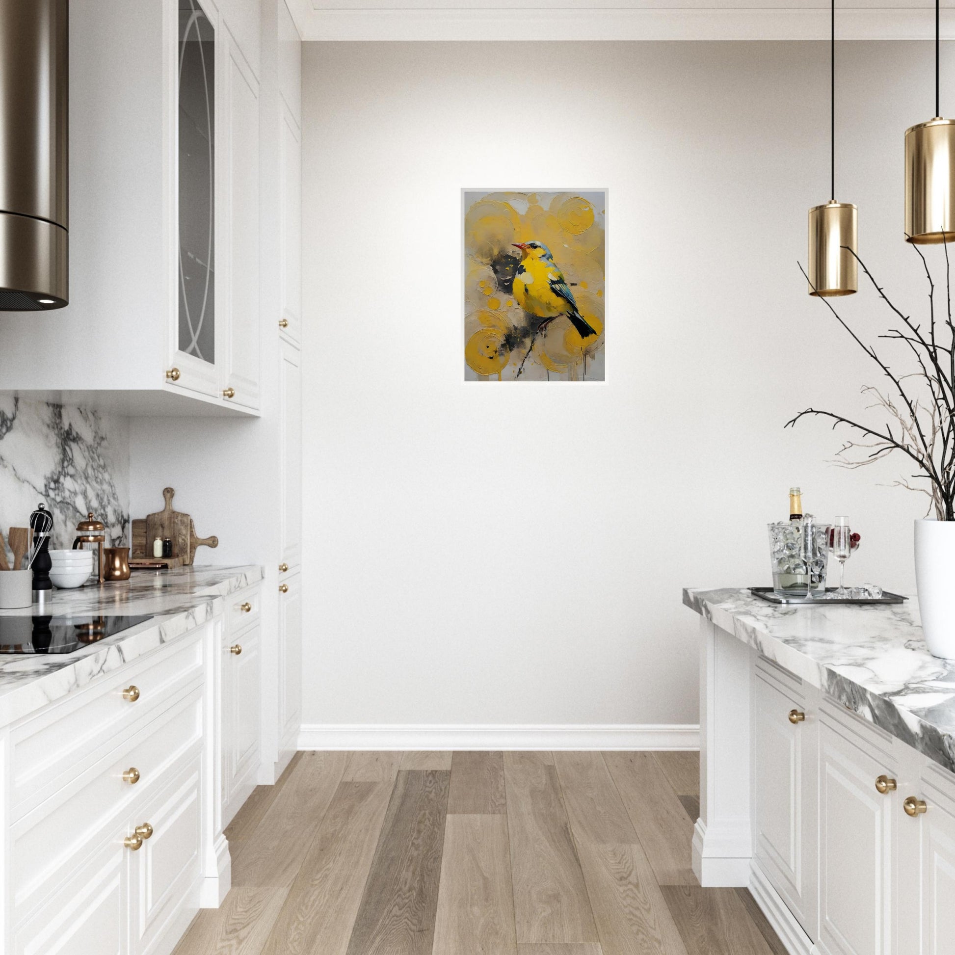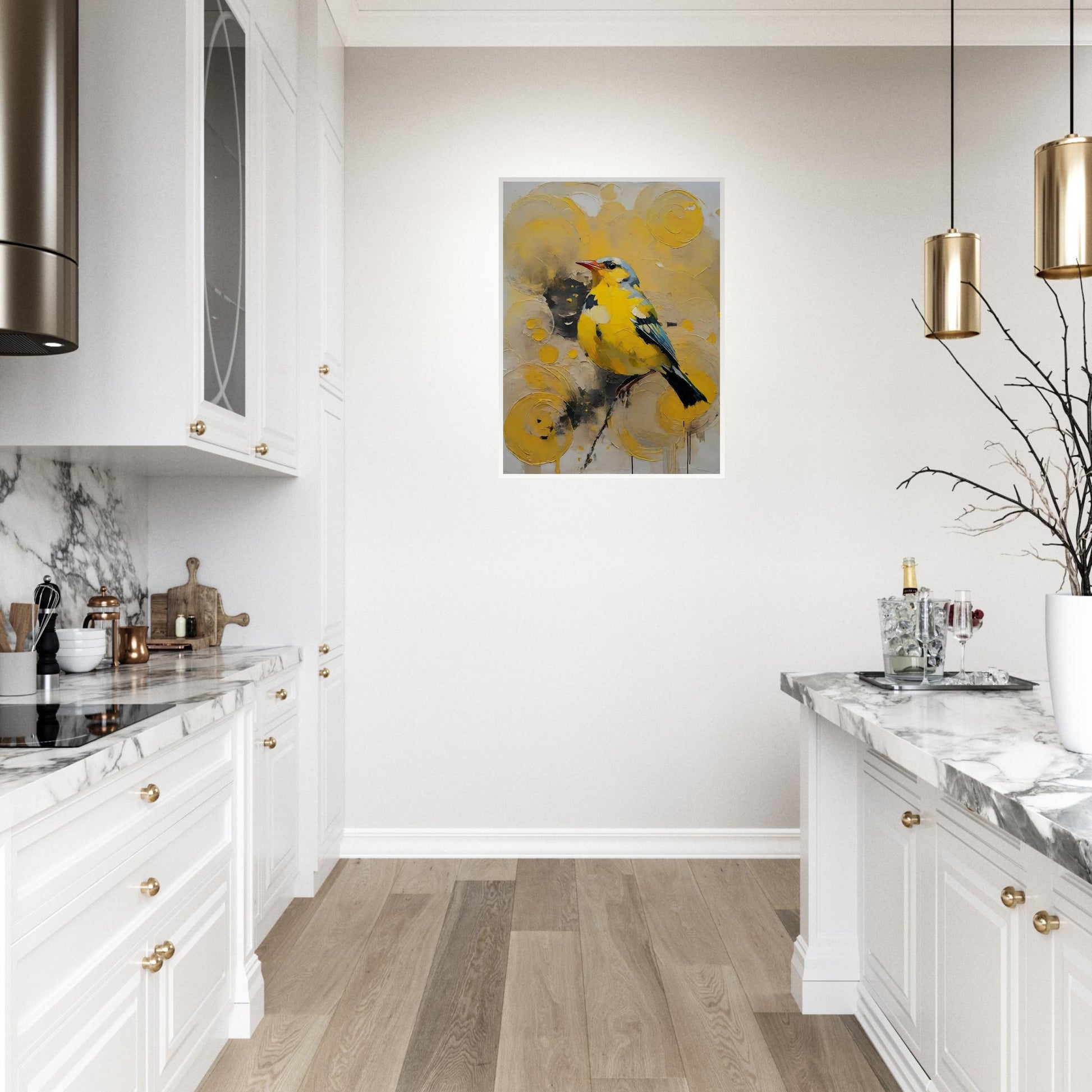 Yellow Bird wall art features a vibrant yellow bird perched against a textured abstract background. The artwork highlights the delicate form and bright colors of the bird, which stand out beautifully against the muted tones in the background. The detailed brushstrokes and rich use of color make this piece a refreshing focal point, offering a sense of calm and harmony with nature.